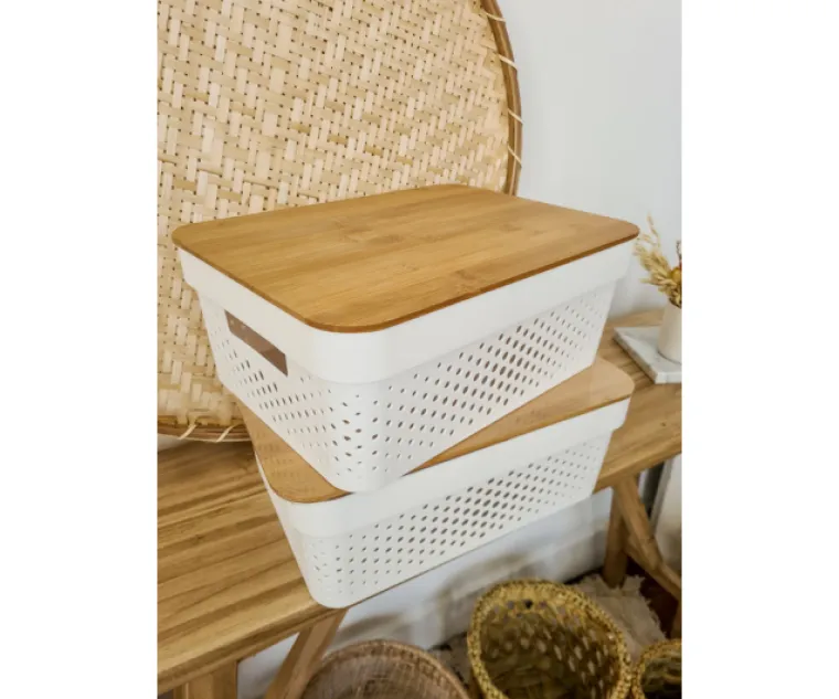 CANASTO CALADO PLASTICO CON TAPA BAMBOO 26 X 18 X 13 COD. TC044A